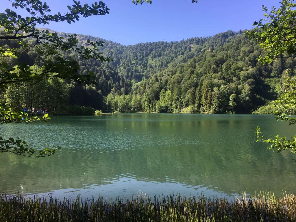 Emrah bizi anayola çıkarınca valizlerimizi araçlarımıza yerleştirip hemen Karagöl yoluna düştük. 8-9 km’lik bir mesafe olduğu ve hafta sonu olmasına rağmen erken vakitte yola koyulduğumuz için hızlıca park alanına vardık. Oldukça zengin bir floraya sahip olan milli parkta ladin, sarıçam, köknar, kayın ağaçları ciddi bir üst örtü oluşturuyor. Orman altında ise Kafkas orman sarmaşığı, eğrelti otu ve orman gülleri oldukça yaygın olarak görülüyor. Gölün deniz seviyesinden yüksekliği 1400 m civarında. Orman içi patika yoldan kısa bir yürüyüşle göl kıyısına erişiliyor. Özellikle kimselerin olmadığı sabahın bu erken saatinde hem sessizliğin içine usul usul yayılan doğanın kendi sesi ve hem de o seslere eşlik eden kokusu büyüleyiciydi adeta. Gölün yanına vardığımızda ise gözlerimize erişen renkler doğaüstü bir yerlere iyilik olsun diye bırakılmış olduğumuz hissini çağrıştırıyordu. Bol bol fotoğraf çekerek, video kaydı alarak ve ağır adımlarla göl çevresinde gezinti yaparak o anların kıymetini bilme gayretindeydik. Gölün hemen kıyısından yükselmeye başlayan yamaçlardaki ağaç örtüsü nazikçe birbirlerinin üzerine binmiş dalları, yapraklarıyla bir seremonide gibiydiler. Çevredeki yüksek tepelerin arasında oluşan boşluk ve çukurluk sayesinde oluşan göl, masmavi göğü lekeleyen beyaz bulutlar, hemen onun altındaki yeşil örtünün yansıyan ışıkları burayı adeta masal ülkesinde bir köşeye çevirmişti. İnsan böyle bir iklimden neden, nasıl ayrılsın ki? Güçlükle, ilerleyen zamanın diğer göreceklerimize izin vermemecesine koştuğuna işaretle kendimizi otoparka ilerleyen, ama hep gözü arkada bulduk. Biz orman içi yolunu geri dönerken piknik amaçlı olmak üzere göl çevresine akım da başlamıştı.