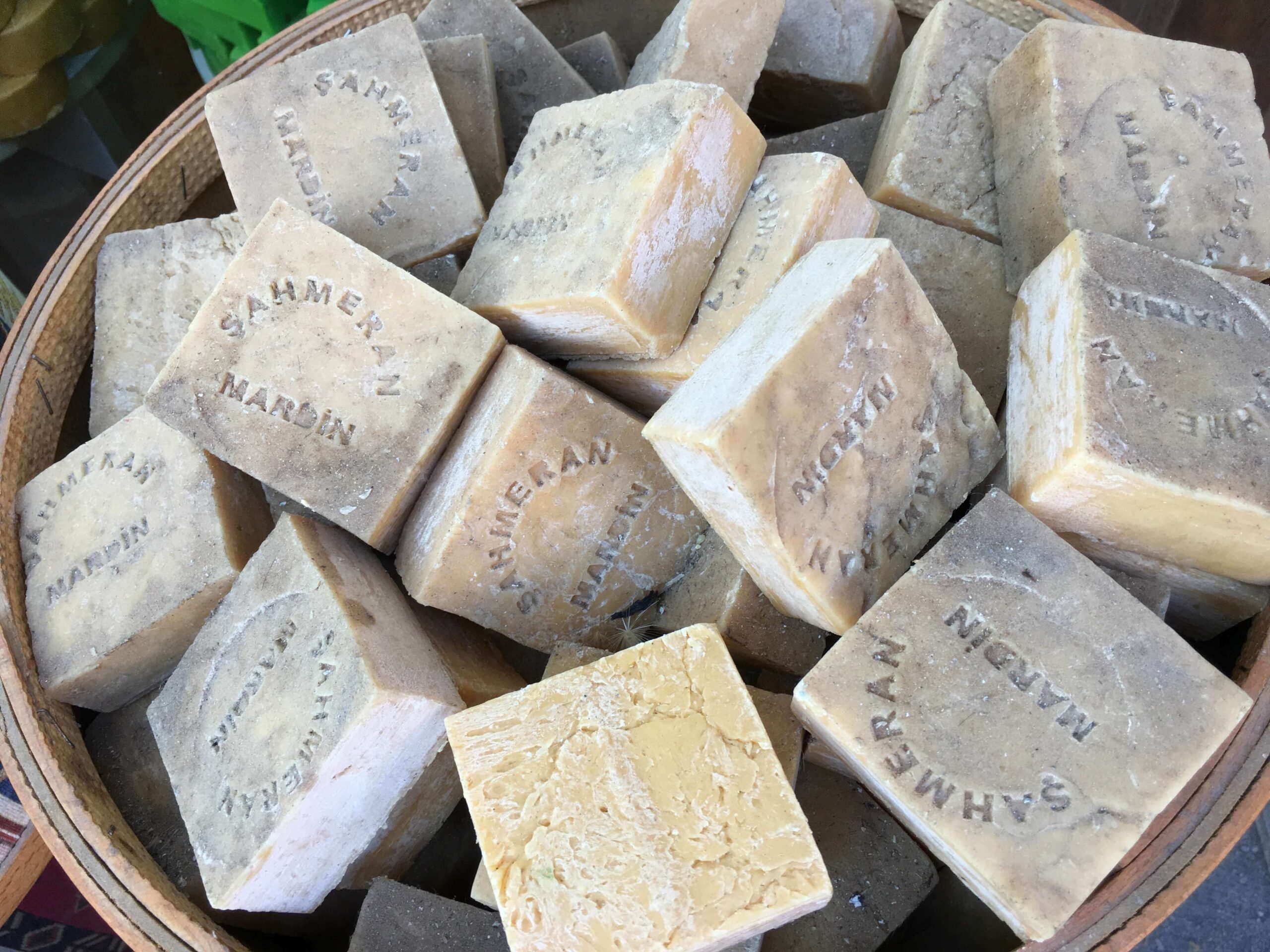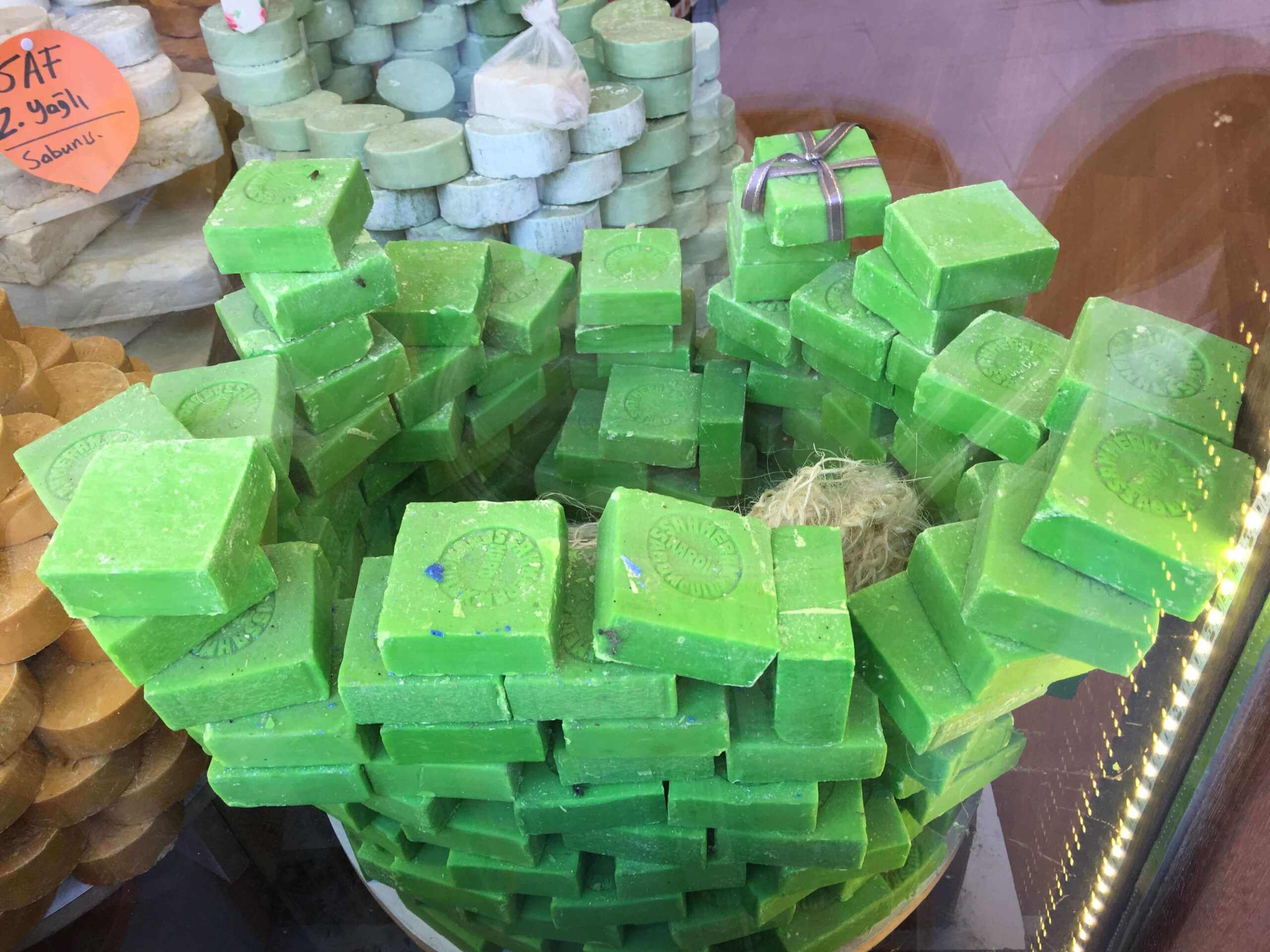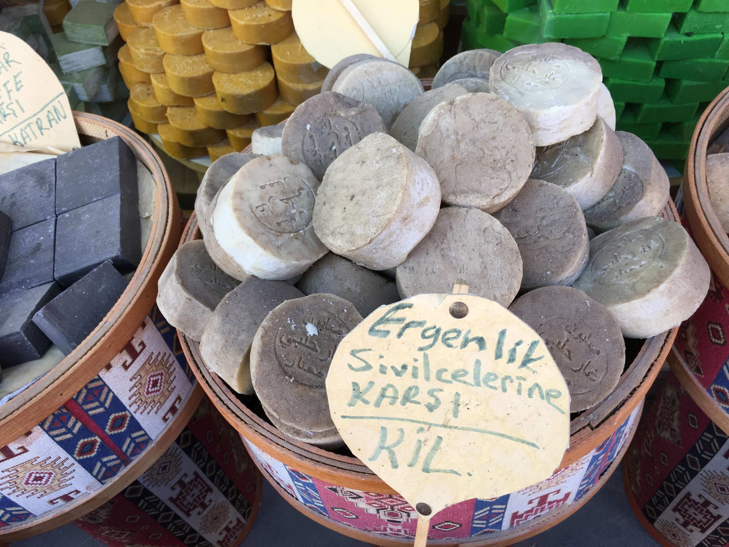 Bu kadar çok doğal sabunu başka nerede bulursunuz bilmem. Çeşit çeşit renk renk bitkisel kökenli sabunlar bıttım (menengiç) ağacından yapılıyor. Zayıf telli saçları beslediği söyleniyor. Bıttım (menengiç), Latince ismi Pistacia terebinthus olan ve Antep fıstığı (Pistacia vera)’nın yakın akrabasıdır. Menegiç ağaçları, Manisa Yunt Dağında olduğu gibi kimi yörelerde aşılanarak Antep fıstığı plantasyonuna alınıyor.