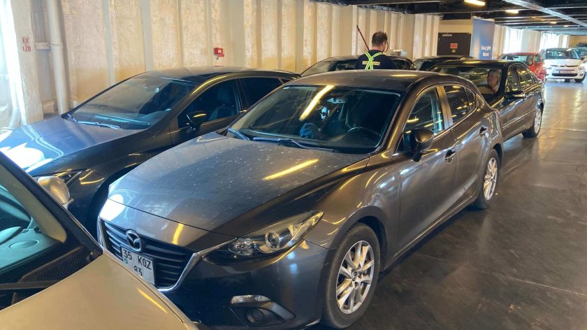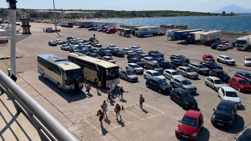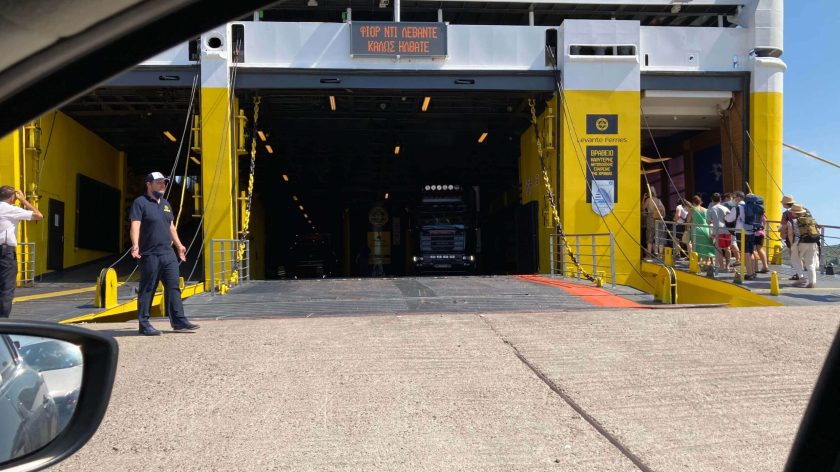 Gemi için bilet alırken kişi sayısının yanısıra aracınız olup olmayacağı da soruluyor. 2022 yılı için Kefalonya gemi bileti kişi başına 13.50 Avro, araç başına 45.00 Avro idi. Yolcu ve araçlar gemiye ayrı ayrı kabul ediliyor. Araçta sadece sürücünün bulunmasına izin veriliyor. Gemilerin araç parkı iki katlı. Üst kat tamamen küçük araçlara ayrılırken girişi ayrı olan alt kat TIR ve kamyonları kabul ediyor. Araçlar gemi rampasından itibaren görevlilerce yönlendiriliyor ve itina ile park edilmeleri sağlanıyor. Aracı park edip yolcu katına ulaşınca uçak konforunda bir yolculuk alanına erişiyorsunuz. Arka güverteden, alımı devam eden araçları, özellikle de TIR’ların gemiye binişlerini izlemek çok zevkli. Bu kadar pratiklik kazanmış olmak için bu işler kaç bin defa yapılmış olabilir ki diye geçiyor insanın içinden. İnanılmaz seviyede seriler hem sürücüler hem de gemi çalışanları.