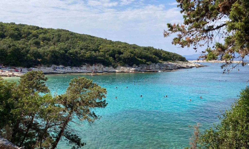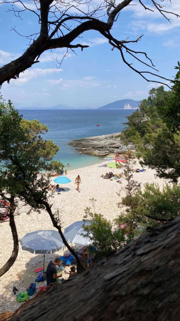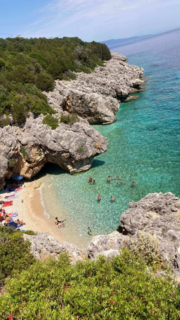 Sert varyantın dönümleri tamamlanınca araçların park edildi bir düzlüğe erişiyorsunuz. Hemen onun bitimi ise plaj. Sahili örten iri taşlar gel-gitlerle yuvarlaklaşmış. Turkuaz suya kendinizi bıraktığınızda “iyiki” dedirtecek bir olağanüstülükte, sakinlikte bir atmosfer çevrenizi sarıyor. Suyun rengi tıpkı diğer İyon Denizi ada plajlarında olduğu gibi göz alıcı. Başınızı kaldırdığınızda, az önceki inişlerle katettiğiniz dağ tepeleri görülüyor. Salın kendinizi huzura.