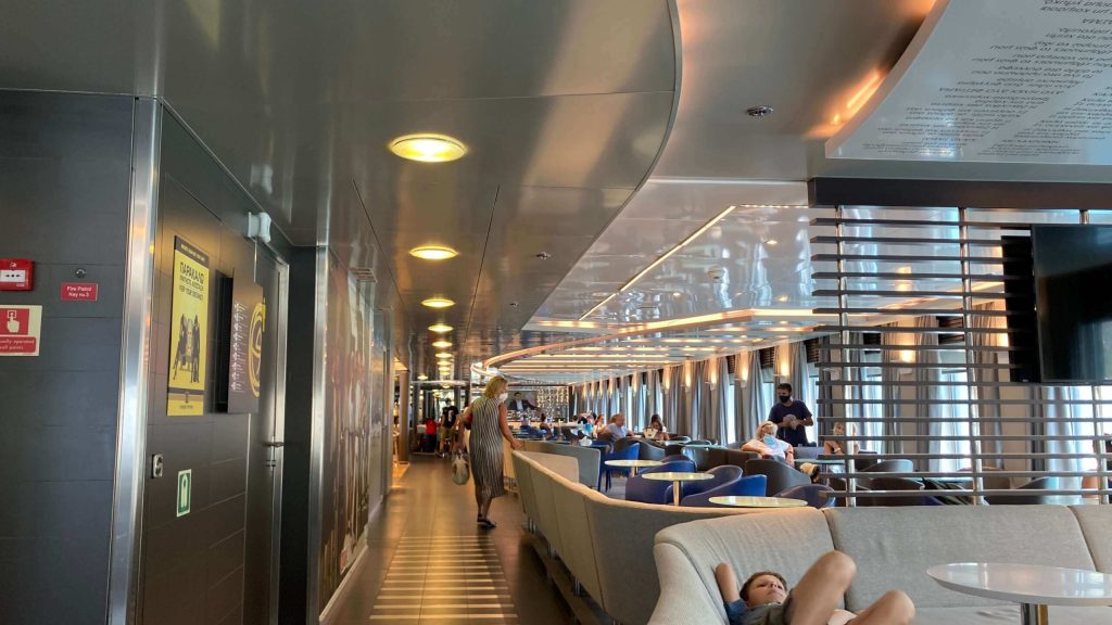 Pulman koltuk olarak bildiğimiz koltuklardan oluşan bölüm koltuğu eğip size uyku vaat edecek sakinlikte. Oturma odası tipi koltuklar seyahat dostlarınızla sohbet için uygunken televizyon izlemek isteyenler için ayrı locaların varlığı şahane. Çocuklar oyun parkında oynarken evcil hayvanların genel kullanım alanında serbest dolaşması uygun bulunmuyor. Olası giysi ve aksesuar ihtiyaçları için gemi butiği de hizmetinizde.