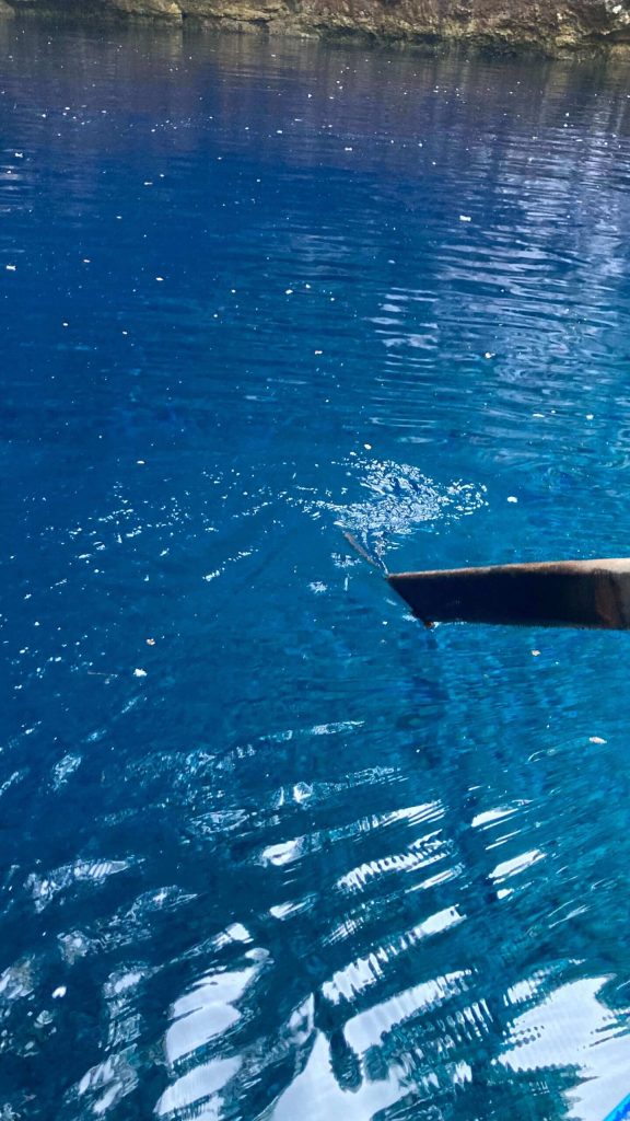 Mağaraya dar bir tünelden geçerek giriliyor. Küçük mavi teknelerle içinde gezinti yapılan çok tatlı bir mağara. Mağaranın tavanının çevresi (ağzı) bitkilerle bezeli. Yüz yıllar önce (depremle) tavan çöktüğü için bu açıklık oluşmuş. Böylece mağaradaki ilk mistik alan ortaya çıkmış. Buradan içeriye düşen ışık mağara içindeki suya ve mağara duvarlarına vurdukça şahane bir görünüm oluşturuyor. Oldukça serin bir ortam. Tekneyi kullanan rehber mağaranın oluşumuna dair bilgiler veriyor. Eğlenceli bir gezinti olması için mağara duvarında yankılanıp geri dönen sesler çıkarıyor (arya söylüyor, küreği suya bandırıp çıkarıyor şıpırdatıyor ya da size bir şarkı söyletiyor).