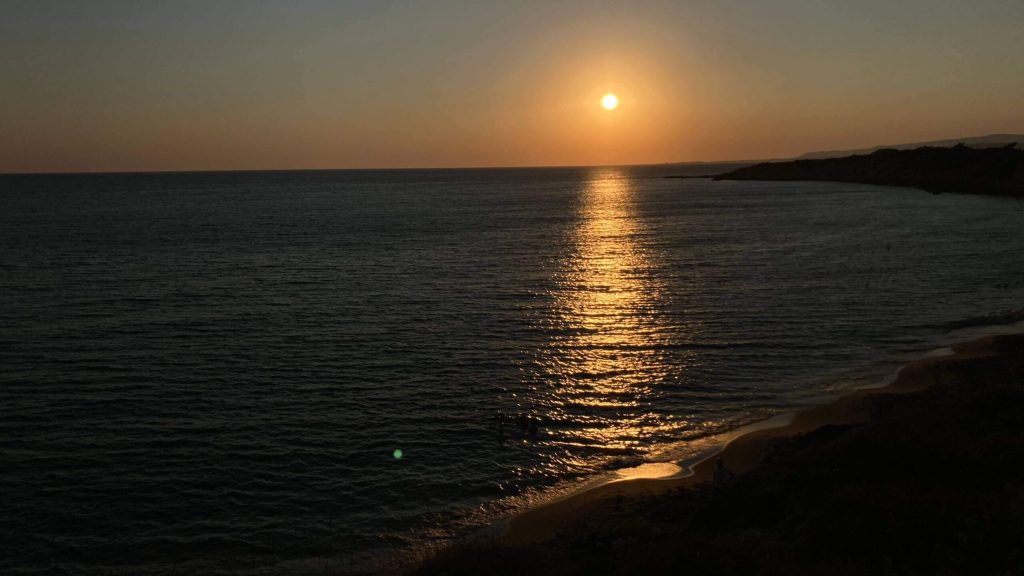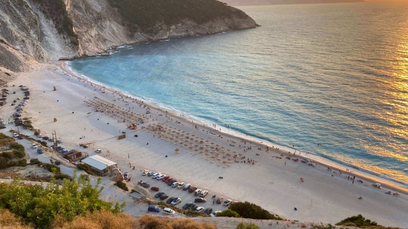 Burası için en uygun sıfat “muazzam” olur herhalde. Akşam üzeri buraya ulaştığımızda, günü burada geçiren kalabalık geri dönüş yolundaydı. Kefalonya adasının en tanınmış, en çok fotoğrafı paylaşılmış plajı burası olabilir. Devasa bir kullanım alanı var. Ne kadar kalabalık olursa olsun henüz daha kalabalık değil hissi uyandıran bir büyüklük bu. Şemsiye, şezlong pek çok yerde olduğu gibi ücretsiz. Dik bir yamacın dibine indiğinizde Kıdrak (Fethiye) misali bir plaja erişiyorsunuz. Doğrudan açık deniz olan İyon Denizi’ne baktığından şahane dalga alıyor. Çok eğlendirici. Bir bölge klasiği olarak turkuaz suyu ihtişamlı. Eğer akşam üzerine kadar plajda kaldıysanız buradan gün batımını da izleyip eve dönmelisiniz. Manzara şahane.