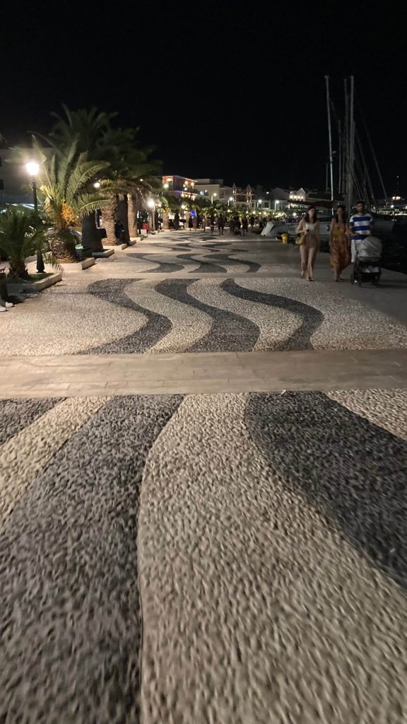 Marinasında bolca tekne bağlı. Gezi tekneleri de aynı iskele boyunca mevcut. Sahil şeridindeki kaldırım tıpkı Izmir Kordonunun ikonik dalgalı çizgileri gibi hatlarla işli.