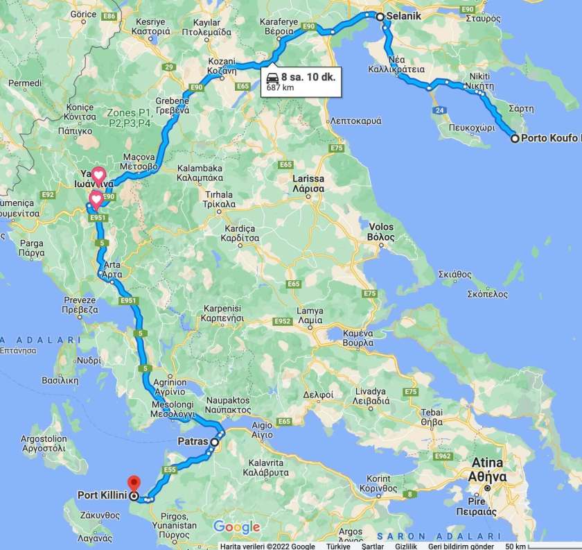 Porto Koufo-Selanik-Patras-Killini yol haritası