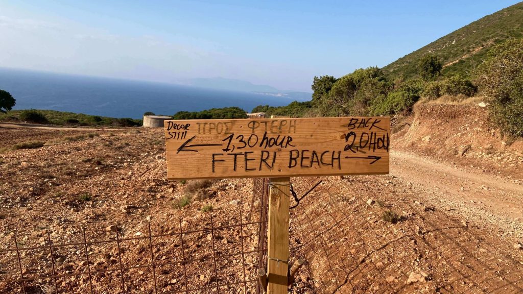 Aracınızı aşağıdaki görselde yer tarlanın kenarında bırakarak “Fteri Beach” tabelasının olduğu köşeden bilinmezliğe doğru yol almaya başlıyorsunuz.