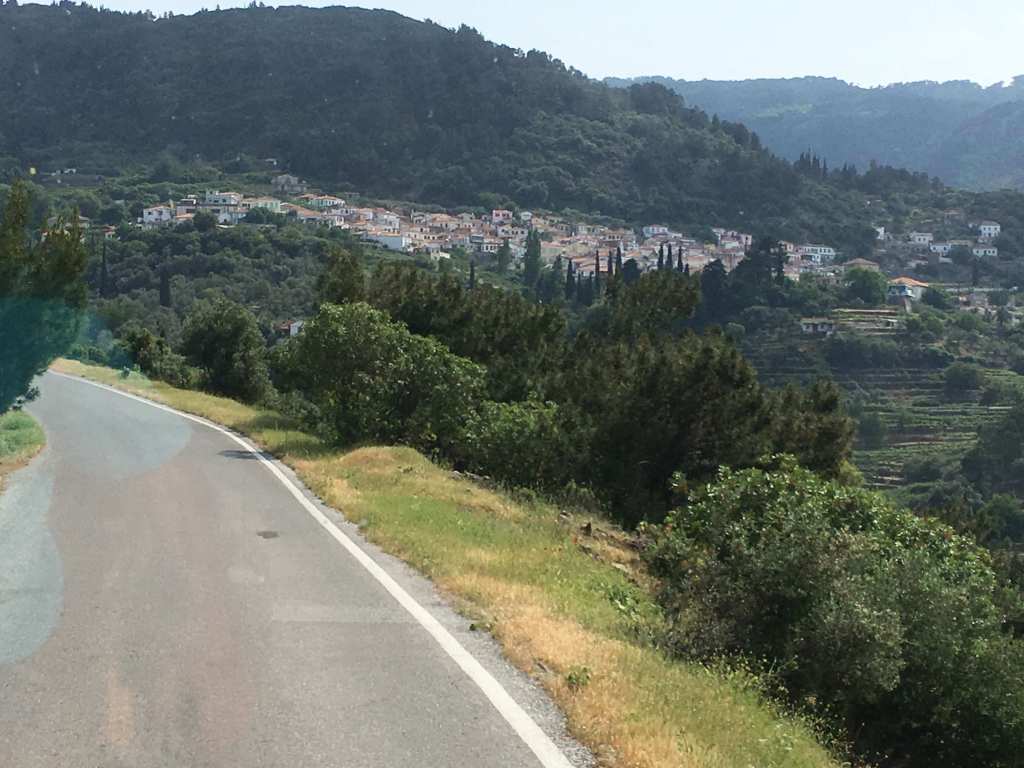 Ana yola 4 km uzaklıktaki bu dağ köyü oldukça kıvrımlı bir orman içi yoluyla sizi kendine çağırıyor. Köyün girişindeki otopark alanına (ki bütün yerleşim yerlerinin hemen girişinde böyle geniş otopark alanları mevcut ve ücretsiz) aracımızı park ediyoruz. Arnavut kaldırımlı dar sokaklarda ilerledikçe sessizlik bir yandan, ağustos böceklerinin yaz neşesi diğer yandan, zeytin ağaçları, şaraplık üzüm bağları diğer yandan sizi başka bir aleme alıp taşıyor. Yemyeşil arasında şahane kırmızı çatılı, beyaz sıvalı küçük küçük evler, kimilerinin içinden gelen yaşlı yaşlı cümleler… Gittiğinize, gördüğünüze değer bir köy… Köy meydanı denebilecek yerde bir kaç kafe size soluklanmak ve yemek yemek için davetkar kokular sunuyor olabilir.