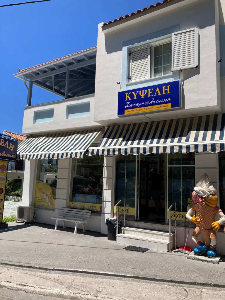 Karlovasi-Vathy arasındaki bu pastaneden mutlaka dondurma yemenizi öneririm. Pastalarsa mükemmel görünüyordu. Önünde onlarca araç durup kalkarken siz de hayret içinde kalabilirsiniz