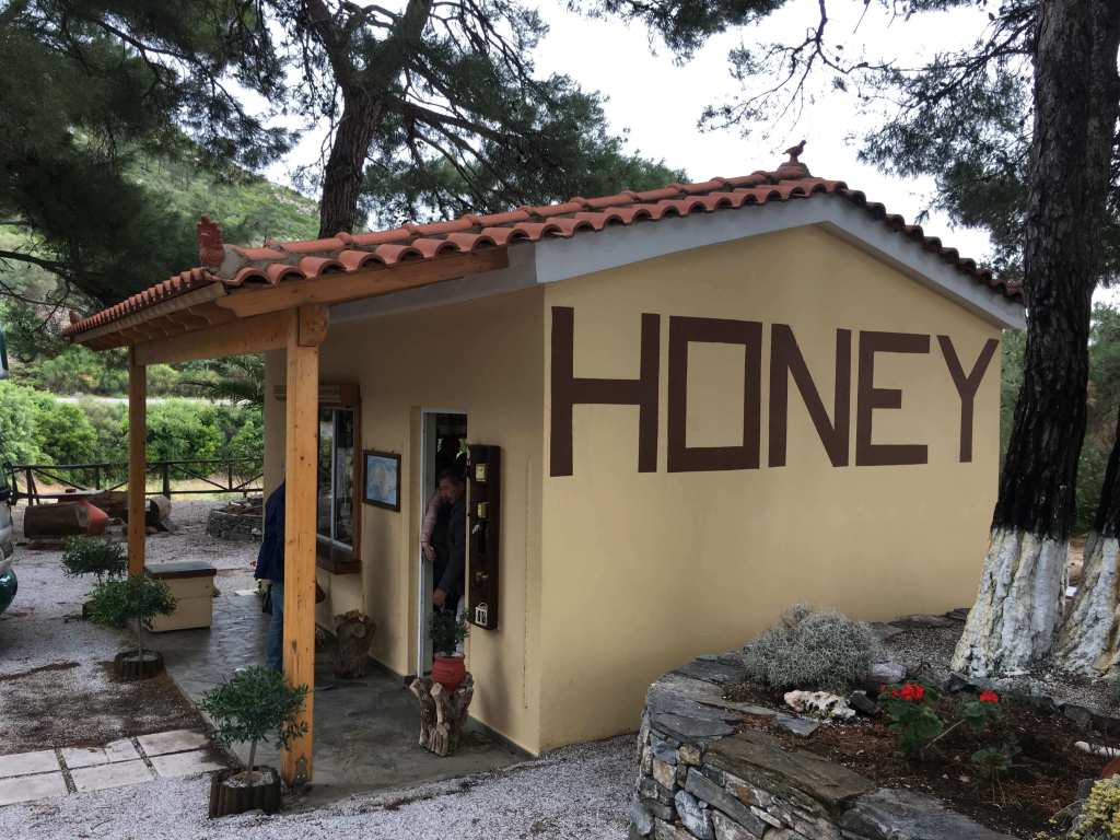 Daha önce adanın bitki örtüsünden ve buna bağlı olarak bal üreticiliğinde söz etmiştim. Burası Karlovasi ile Phytagorion arasında, tepede bir tesis. Çam ağaçlarının altında dinlenip denizi yukarıdan izlerken tahta kulübe/satış yeri içinde sunulan bal ve şaraplardan tadım yapabilir, satın alabilirsiniz. Samos şarabı biraz daha şeker oranı yüksek, likör kategorisinde yer alan bir içki. Bal ise çiçek balı kokusu ve lezzeti veren bir tatta. Açık renkli.