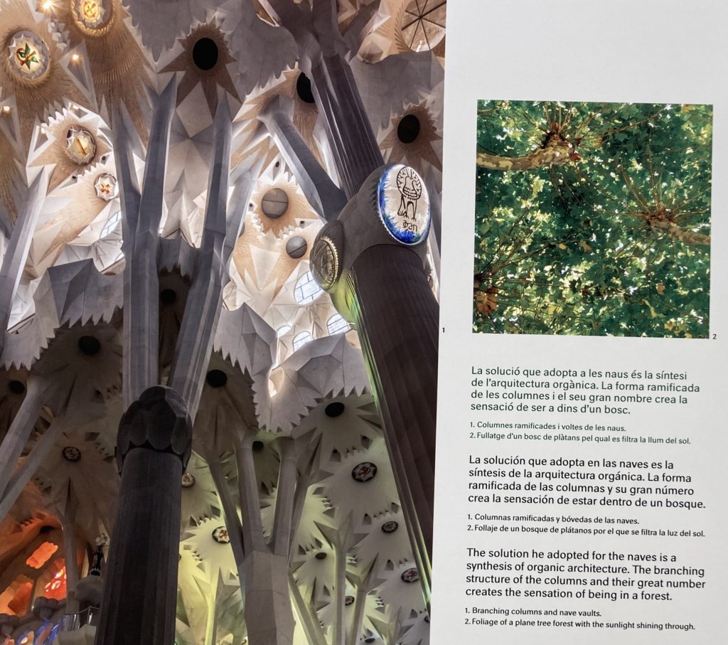 Bazilikanın içinde yürürken, insanda ormanda dolaşıyor hissi oluşuyor. Gaudi, iç yapıyı ayakta tutan kolonları tasarlarken dallanıp budaklanan ağaçlardan esinlenmekle bunu sağlamış.