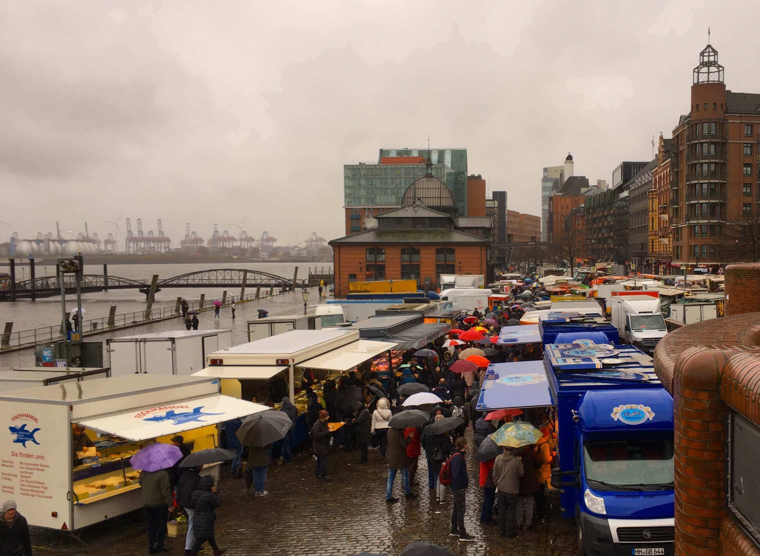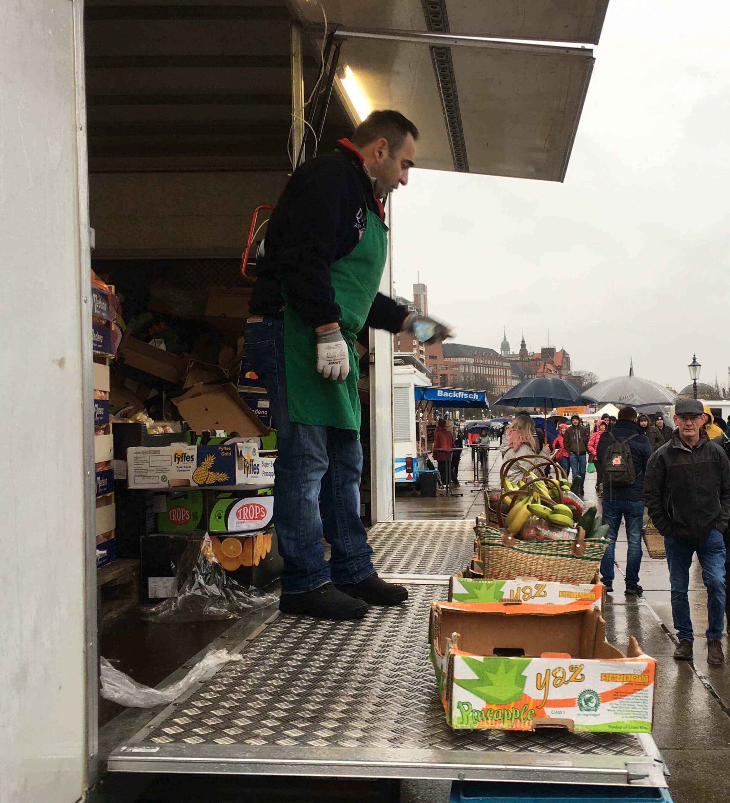 Elbe Nehri kıyısından yürüyüp Fischmarkt bölgesine geliyoruz. Limanda, geniş araç park alanına kurulu pazarın bu bölümü, kolayca, karavandan pazar tezgahına dönüşebilen araçlardan oluşuyor.