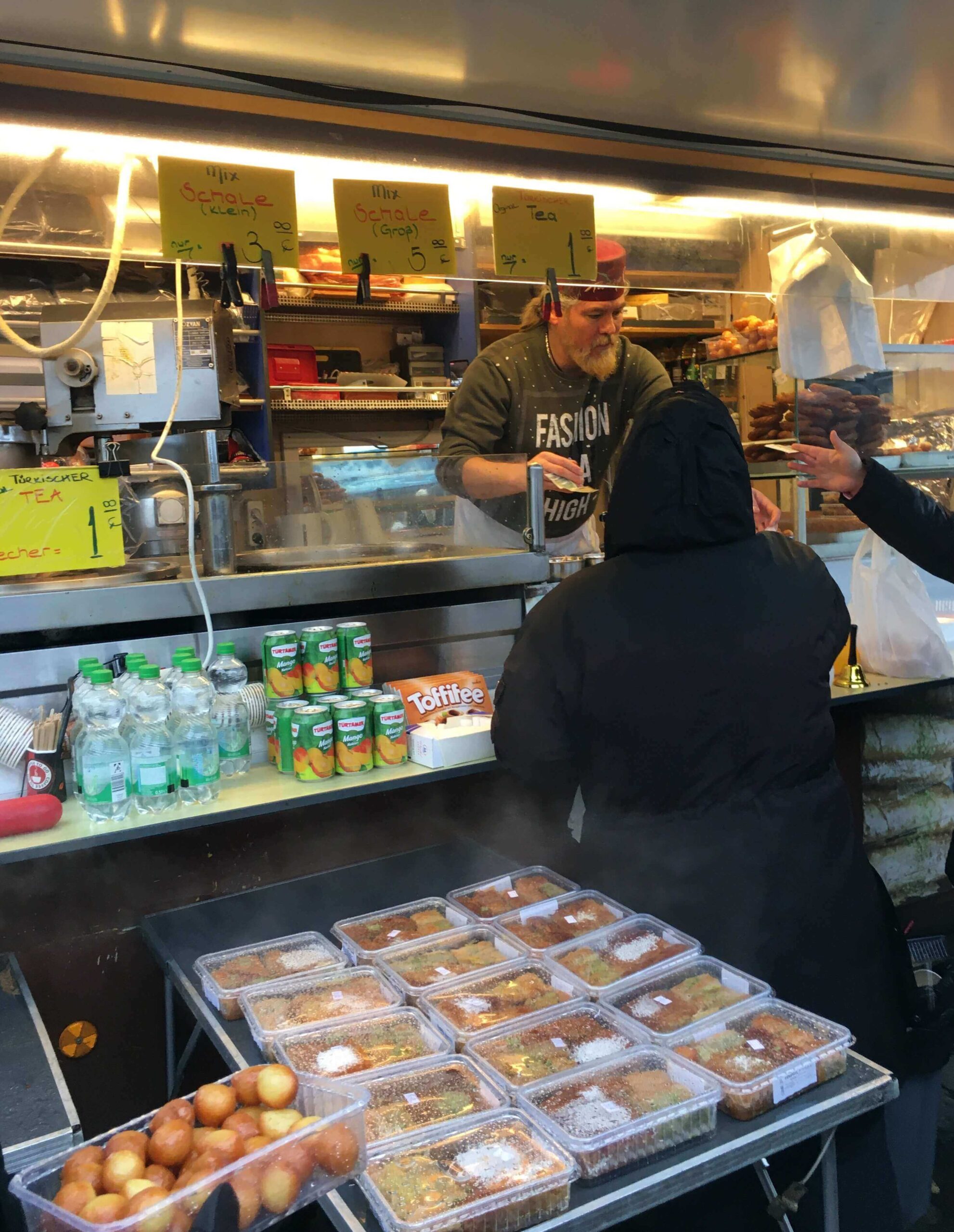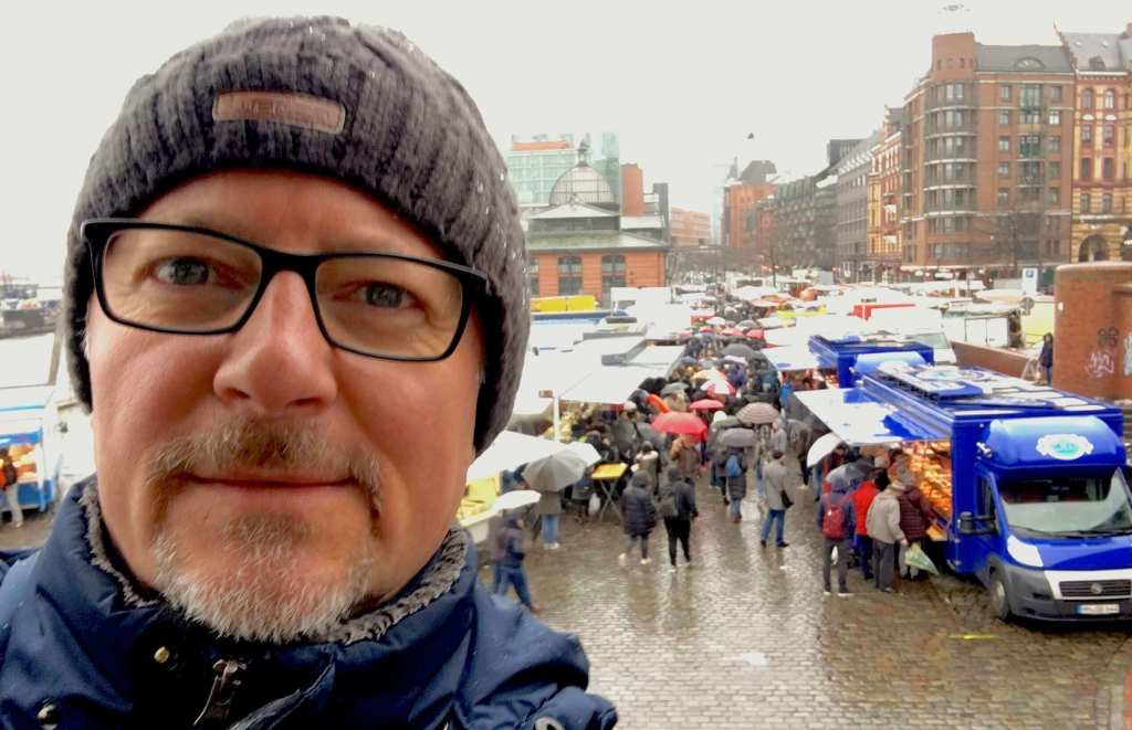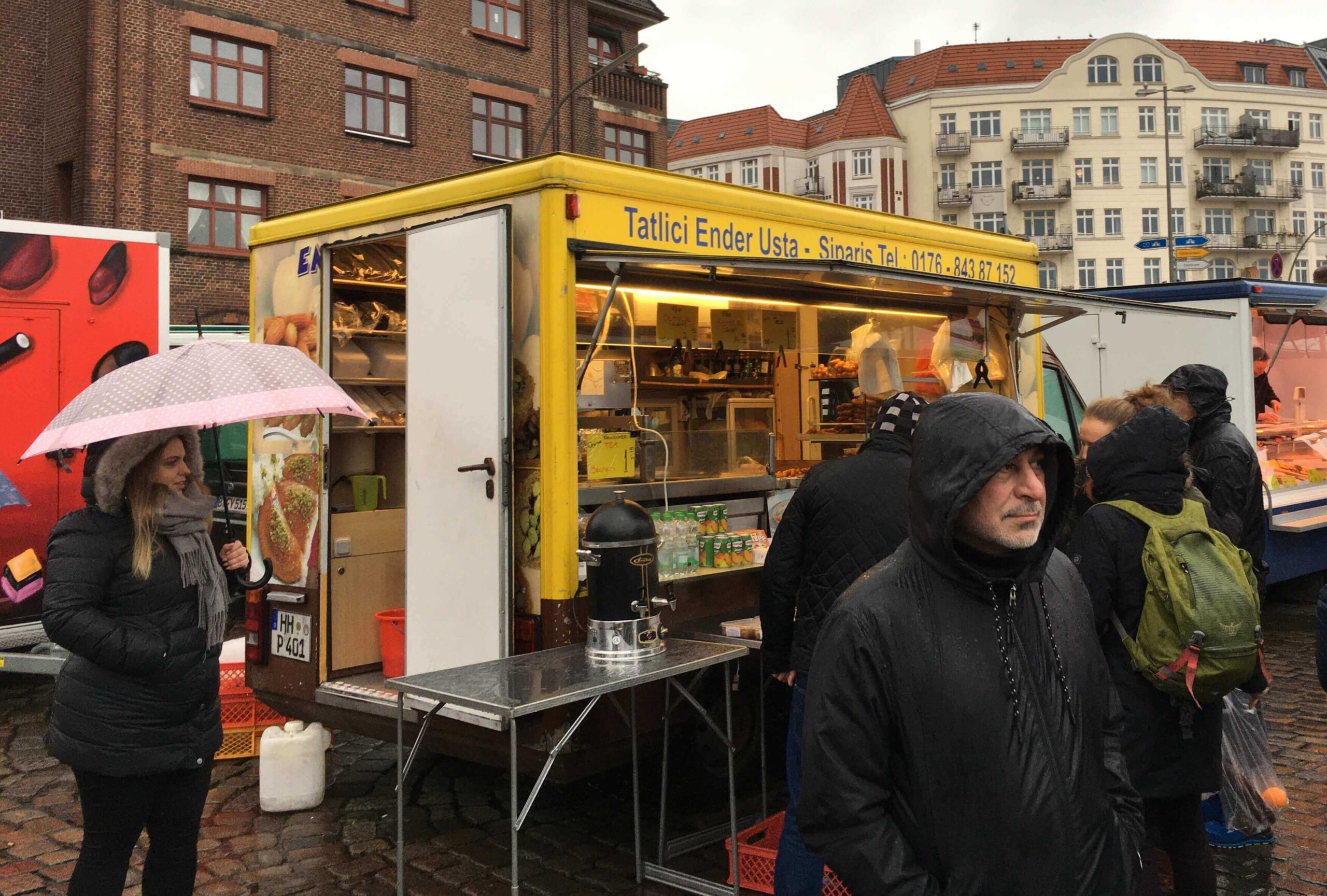 Dışarıdaki pazarda aynı saatlerde alış veriş başlamış olacak, sabah beş (kışın 06.00, https://www.fischauktionshalle.com/). Ekmek arası balıktan file file tropik meyvelere; Gaziantepli baklavacı abiden çorapçıya kadar herkes orada. Bu bir ritüel. Taşkınlık yok. Uygun fiyatta alışveriş, sonra sosyallik.